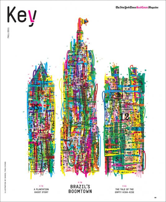 Illustrator, designer, and artist Daniel Ting Chong based in Cape Town South Africa has added to the creative legacy that is the cover spot in Key, The New York Times Real Estate Magazine. This towering achievement of color, complexity and structure joins the likes of Ingrid Siliakus, Carin Goldberg, John Maeda, and Trollbäck + Company in this cutting edge series.