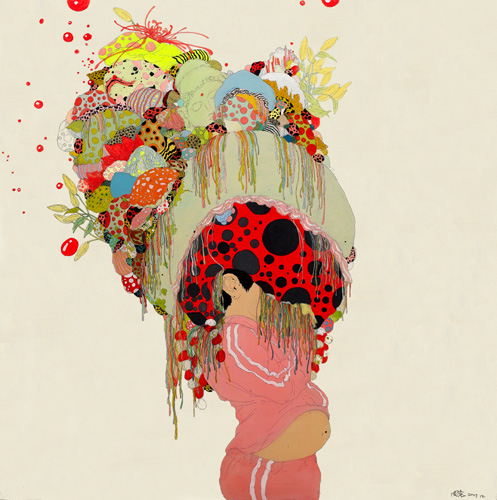 “A series of my paintings is based on dreams that I had as a child of many many jellyfish floating in the sky, some of which fell to the ground on parachures and became mushrooms. These dreams had a strong impact on me, and I remember them vividly. Somehow I feel that it is easier to focus on dreams than reality. In one particular painting, there is a boy crying because he keeps things within him, is easily sad, and he refuses to face reality.”