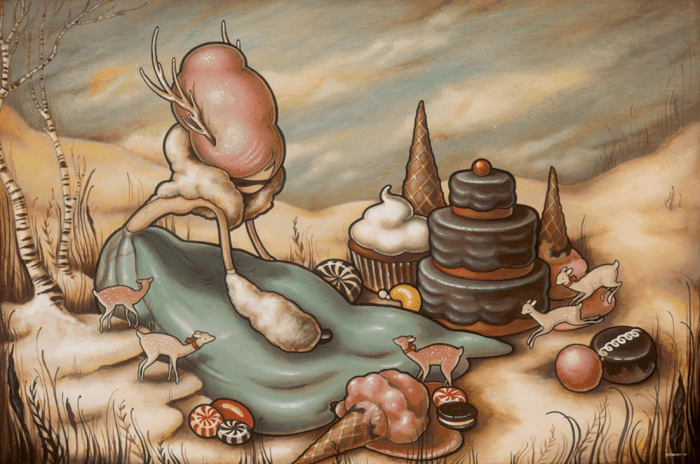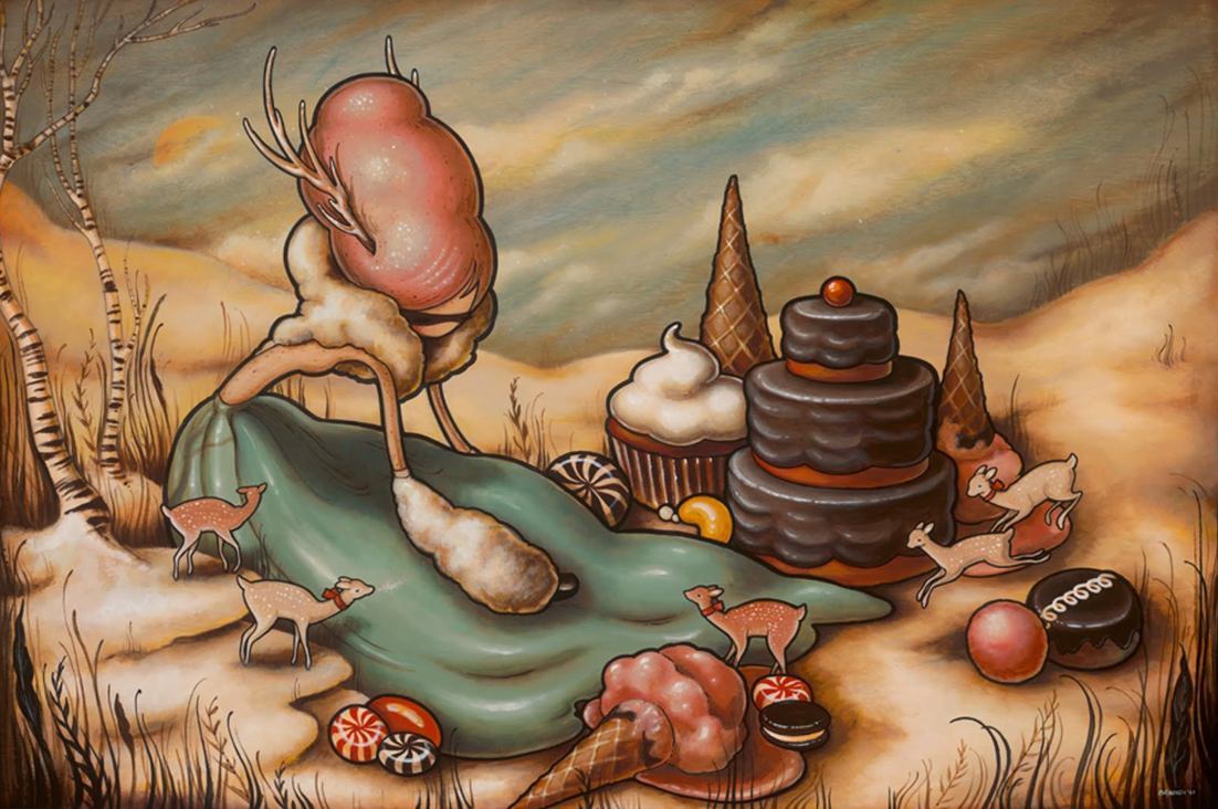She is influenced by classic comics, by the oddities of the 1970’s and 80’s and vintage Halloween decorations. Brandi Milne is a self-thaught artist from California.