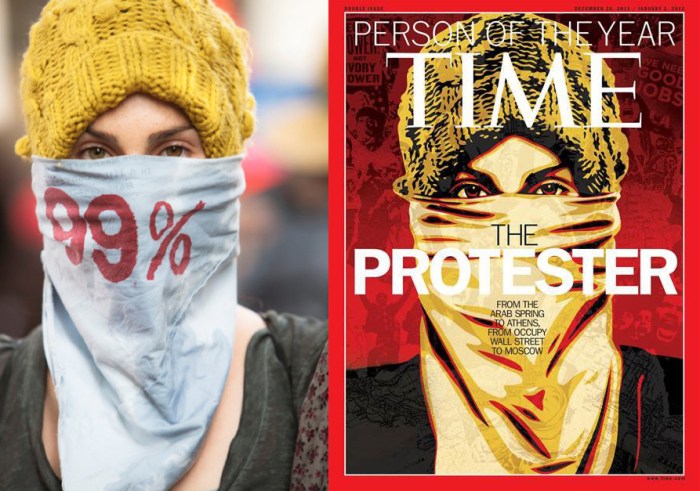 I think that Time Magazine chose the exact right person to create the image for The Protestor as Person of the Year, someone that regularly “takes” the work of someone else for their own gain, the same as Tahrir Square, Wall Street or on the newstand. Fairey is controversial – he is anti-establishment, yet firmly entrenched in the top 1% of the multi-billion dollar art world, a lethal combination of revolutionary imagery and the latest technologies. I would be disappointed if Fairey did NOT ape a photographer’s work for this cover image. The fact that so many entities are involved in the piece, freelance photographer, “alternative” weekly, photo agency, corporate publishing giant, and “street” artist puts us square in the crossroads of who owns what, copyright law, fair use and the remix generation we find ourselves in.