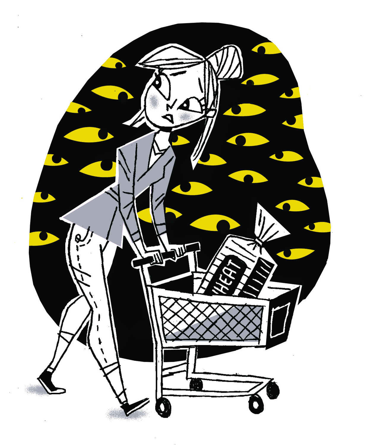 woman with a grocery cart, eyes are looking at her