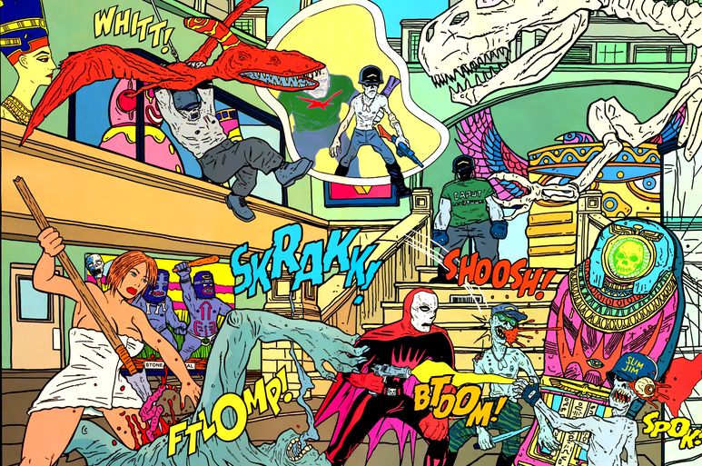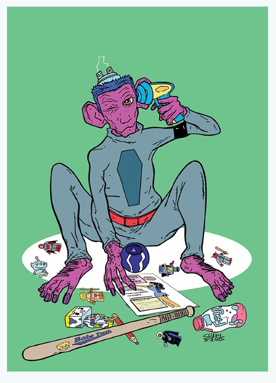 Shaky Kane(AKA the British gent Michael Coulthard) is a comics writer & artist who began his career working on popular British indy comics magazines such as Deadline, Revolver, and Escape Magazine. Kane’s hallucinatory and psychedelic style stems from his love of classic punk rock flyer and poster art and comics masters like Jack Kirby, Ed ‘Big Daddy’ Roth, and Brendan McCarthy, just to name a few.